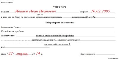 | Образец медицинской справки в бассейн для ребёнка (до 14 лет) |